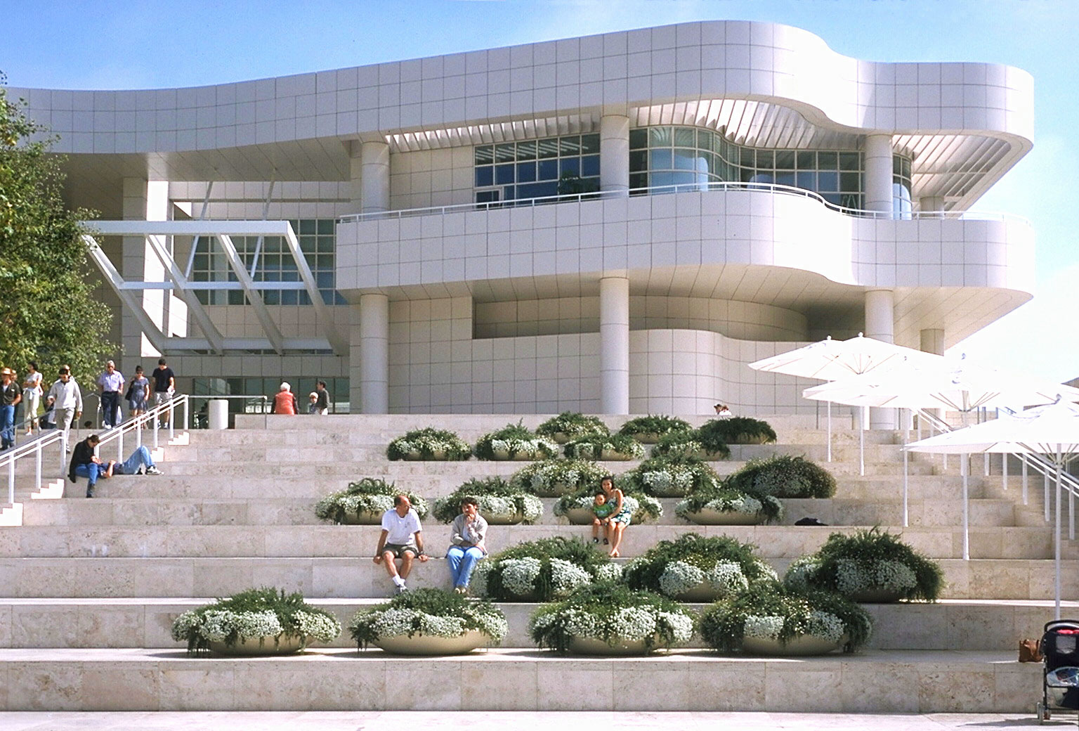 horizontal planters with white flowers on stepped seating, grand stairway