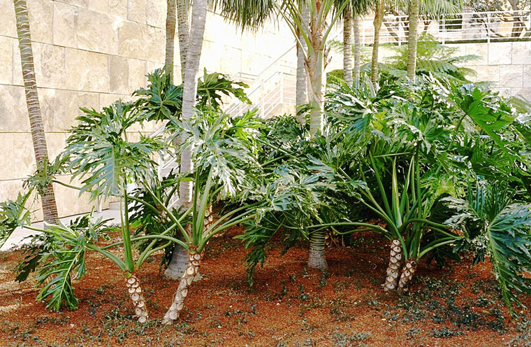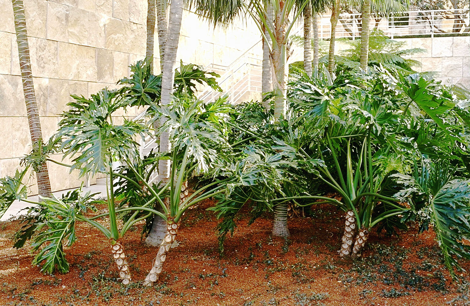 Philodendron bipinnatifidum, underplanted with Vinca minor, in palm court between East and North Buildings |