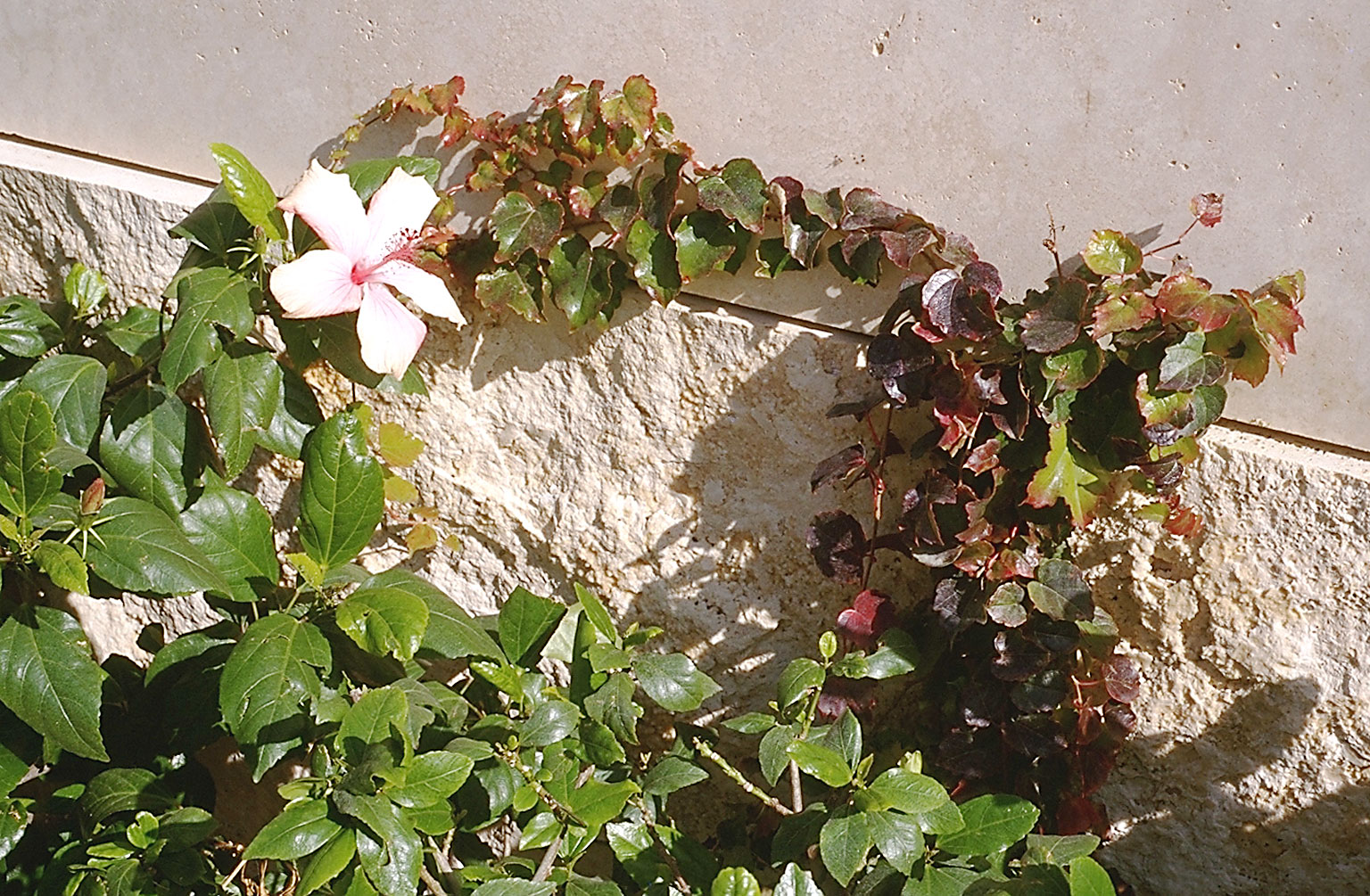 Pink Hibiscus below, Boston Ivy (Parthenosisis tricuspidata) above |