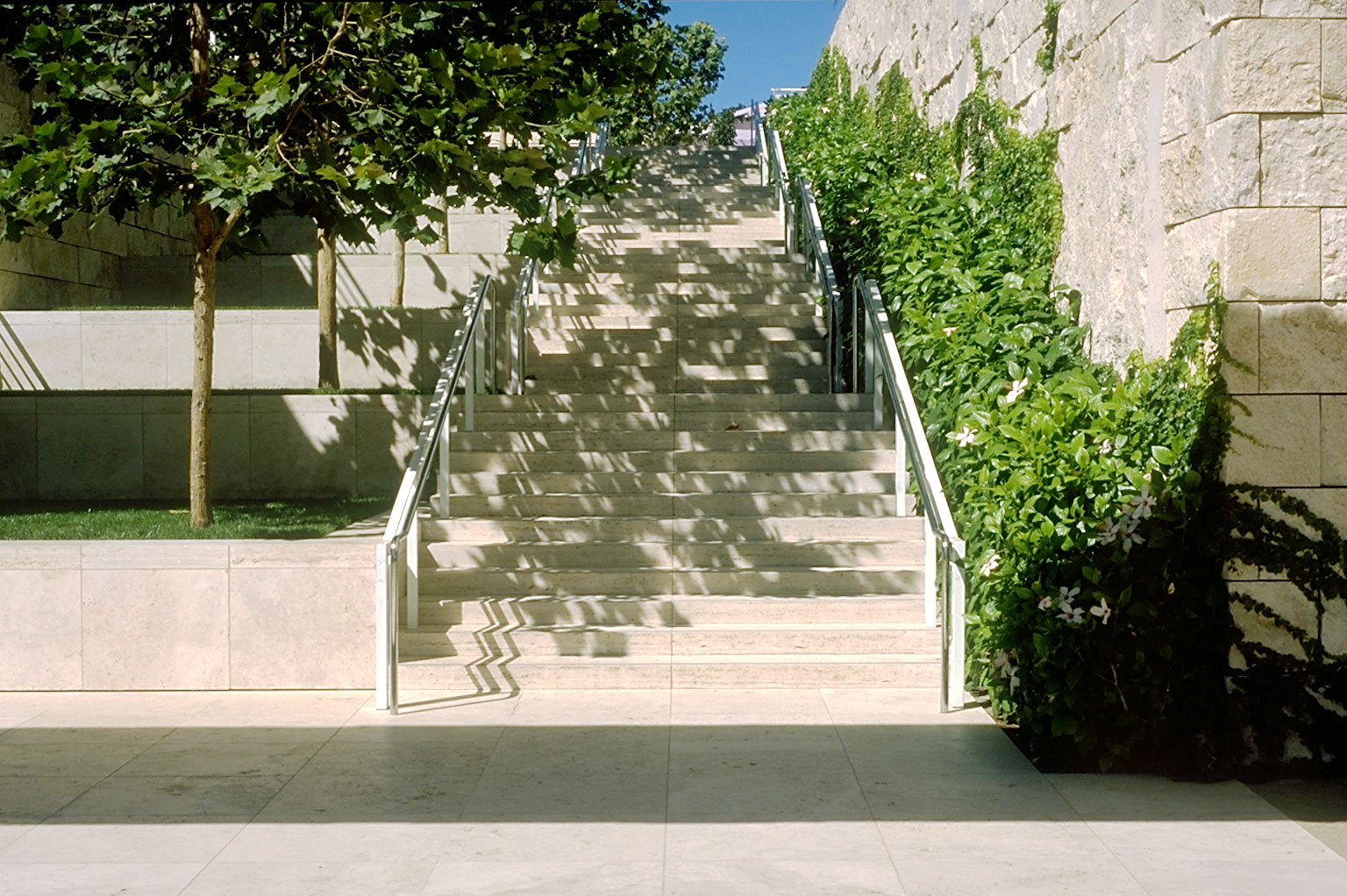 Pink Hibiscus and Boston Ivy on wall beside stairs between upper level and garden sculture |