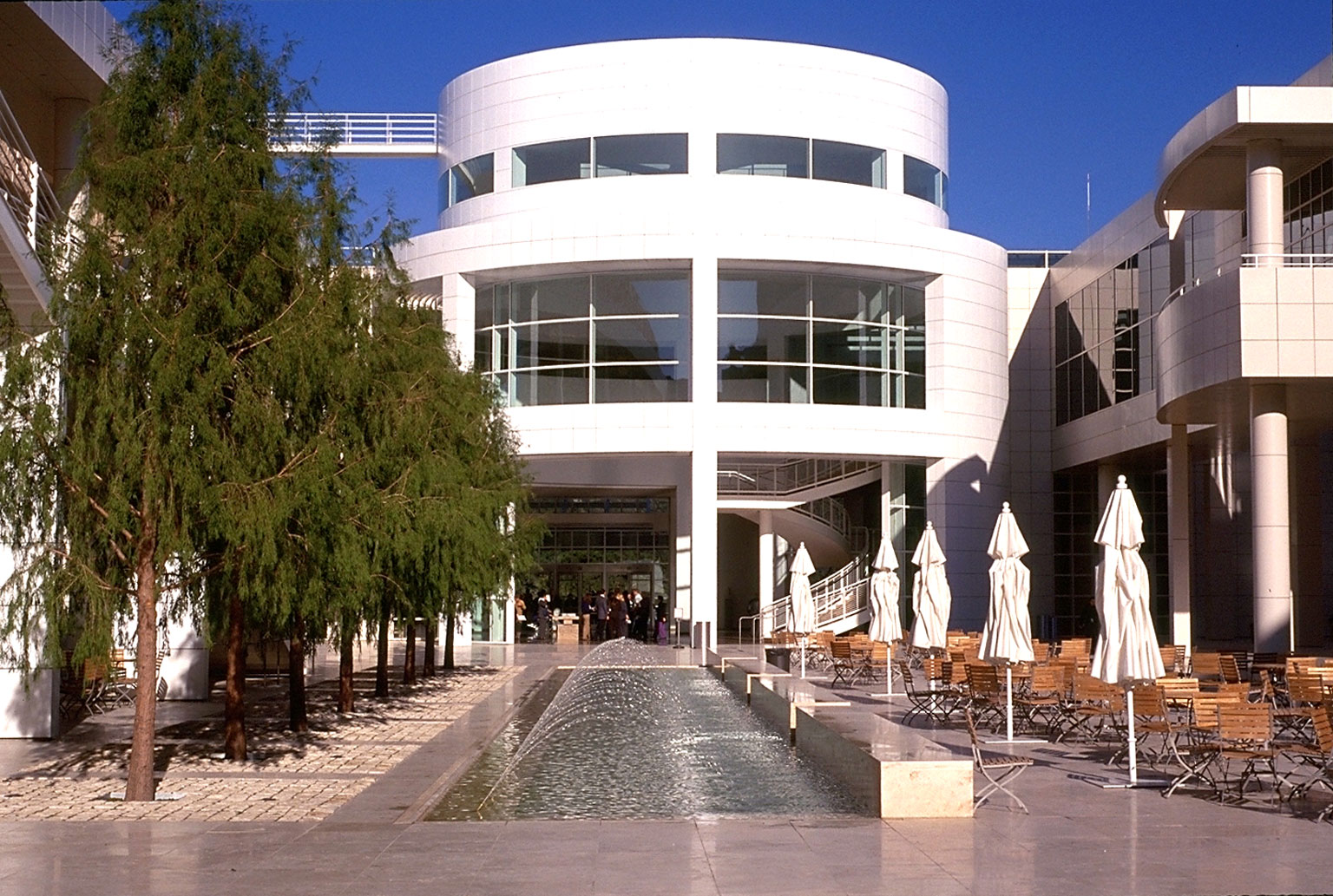 Museum courtyard, long pool flush with paving, arching jets |