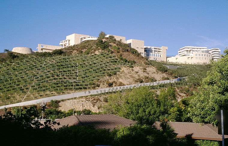 California Live Oak trees planted in rows on side of southeast prow of Getty site, underplanted with fire resistent native poverty weed (Iva hayesiana)