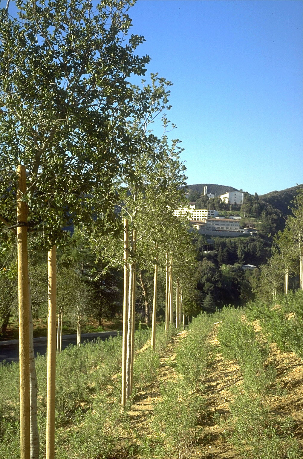 rows of staked California Live Oak trees and fire resistent native poverty weed (Iva hayesiana) below Research Institute |