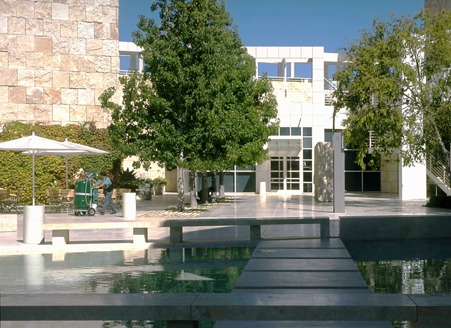 central courtyard entrance to south pavilion, central pool stepping stones in foreground |
