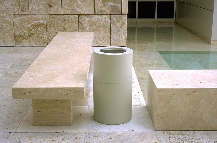Museum courtyard central fountain; flush bench at right 1997, raised bench at left 1999 |