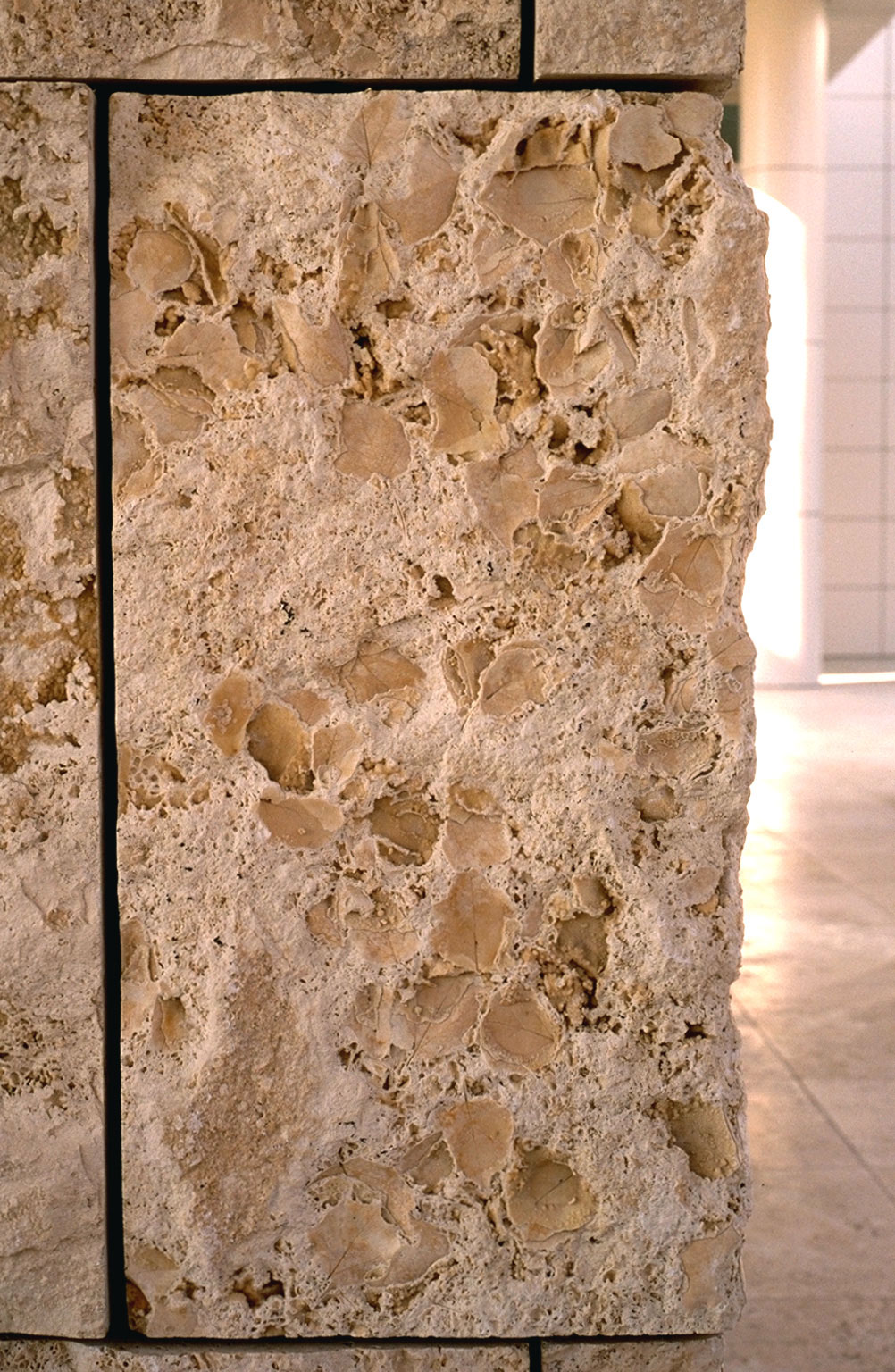 corner of wall at end of outdoor Museum cafe, travertine panel with leaf fossils |