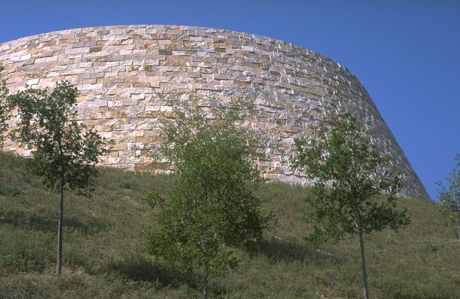 sloping helipad wall from below, most richly colored travertine at Getty Center |