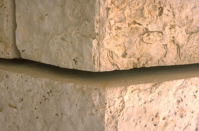 mitered travertine corner below Auditorium overhang |