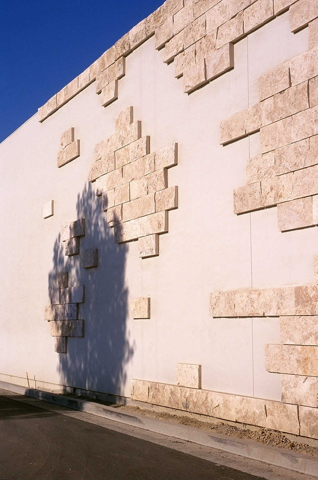 wall beside service road, with transition from travertine panels to stuccoed concrete wall
