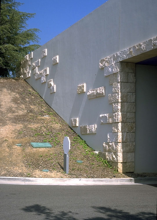 service road underpass, transition from travertine panels to stuccoed concrete wall |