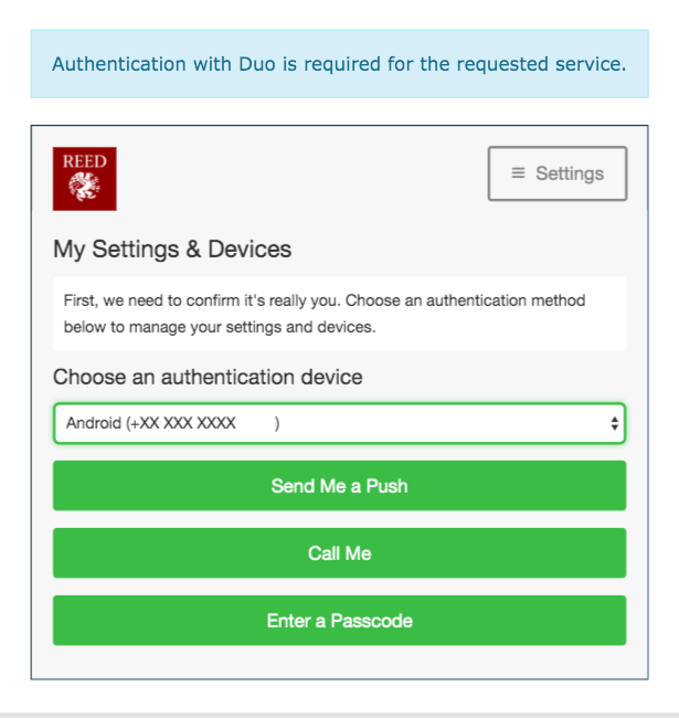 - Before managing devices, you are prompted to authenticate with Duo. Choose the "Phone call" option to have it call your phone. Your phone will ring, and a robo-human will ask you to push any number on your phone.