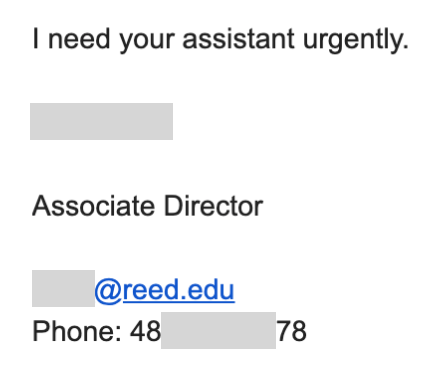 This is a pretty standard phishing message. A short message with a sense of urgency, sent from a non-Reed address (<first.last><#>@example.com), impersonating a community member (name and title, even the correct email address listed in the body). In this case, the phone in the message signature is not the staff member's actual phone number.