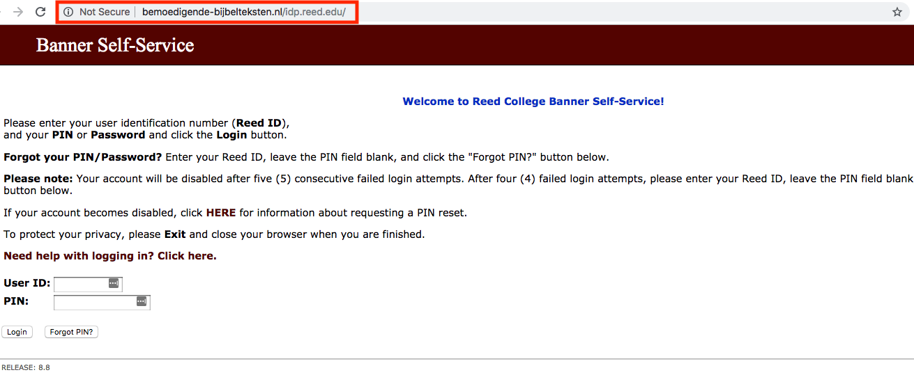 A couple of different spear phish messages targeted hundreds of Reedies that led to fake Reed login pages. Without scrutinizing the URL, the web pages look identical to the legit ones. Please change your Kerberos and Banner web passwords immediately if you suspect entering your credentials on the bogus websites.