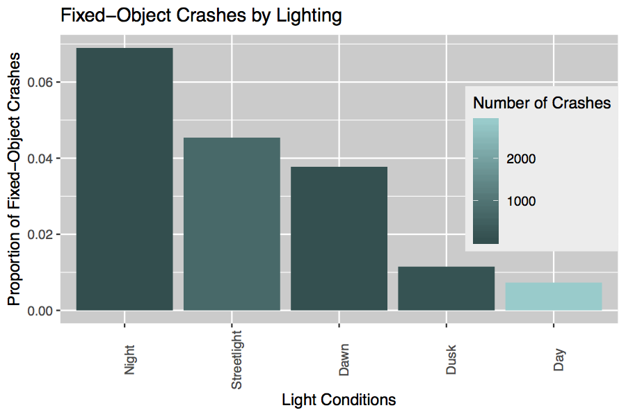 For another example, we wanted to see under which lighting conditions you are most likely to collide with a fixed object like a light post or fence. The majority of crashes occur in the day, so it is not fair to simply count the number of collisions with fixed objects by time of day. Instead, the graph below shows the proportion of accidents that were caused by a collision with a fixed object, for each type of lighting (night, dawn, day, etc.). We can clearly see a relationship between visibility and fixed-object crashes. Using color to illustrate the number of crashes, we can still see that the most fixed-object crashes occur in the day, but the highest proportion occurs at night.