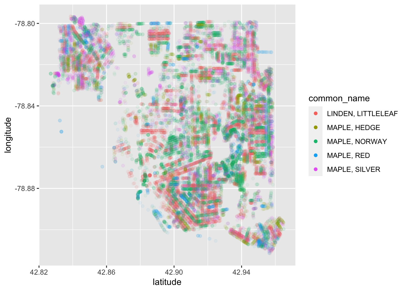 As there are over 300 types of trees in this dataset, we will focus on a few of the most common for the graphs below. Four of the five most common tree types are various breeds of maple, and collectively these five species account for over 20% of the total trees in the city. One should note that this dataset isnt perfectly tidy—more than 40% of trees in the dataset simply state “vacant” as their tree type, which suggests that much of the data is incomplete. Using the latitude and longitude of each tree we can create a map that shows what kinds of trees are where.