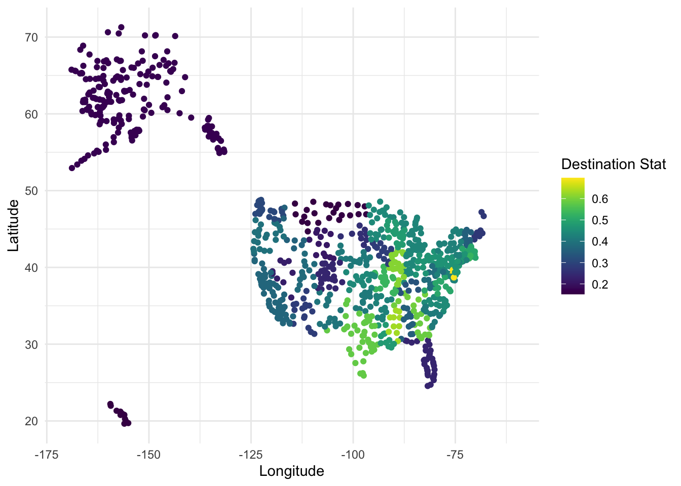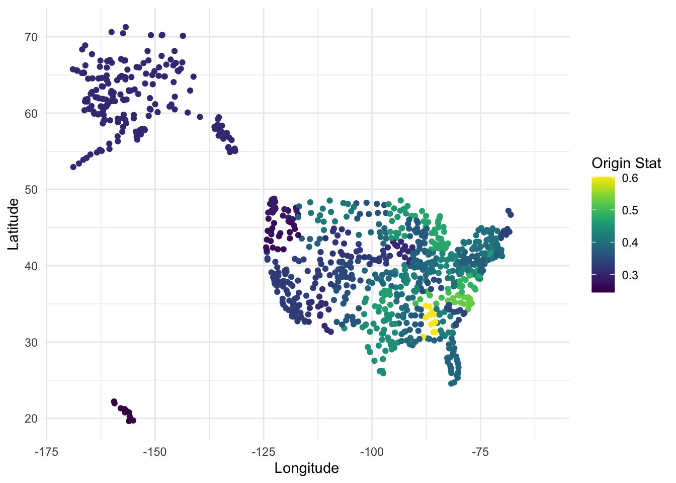 Airports are represented as points and the color shows the business travel index for that airport. A higher index means a higher proportion of business flyers. Notice that certain states have a uniformly high business travel index (Texas, Mississippi, Georgia) and that other states have a uniformly low business travel index (Alaska, Florida, Hawaii). This pattern largely agrees with our intuition: while a large share of people probably flies to Hawaii for the view and the beaches, the passengers traveling to Texas, Mississippi, and Georgia through commercial airlines are likely going to get some work done. Among the 991 airports reported in the data set, Honolulu Int’l Airport has the lowest business travel index (closely followed by Ted Stevens Anchorage Int’l Airport in Alaska), while Jackson-Medgar Wiley Evers Int’l Airport in Mississippi has the highest index (followed by both airports in Chicago, IL).