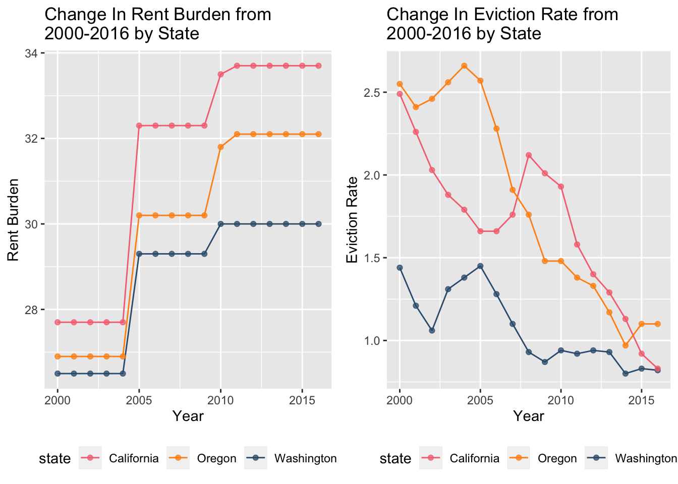 Alongside these eviction rates, the Eviction Lab compiles other relevant data such as average rent costs, annual incomes, and poverty rates. The dataset in our package contains these variables alongside eviction rates for Washington, Oregon, and California from 2000-2016. As an example of how this data can be utilized, we generated the following graphs. These show us that although rent burden increased from 2000 to 2016 in each of these states, eviction rates in that timeframe declined.