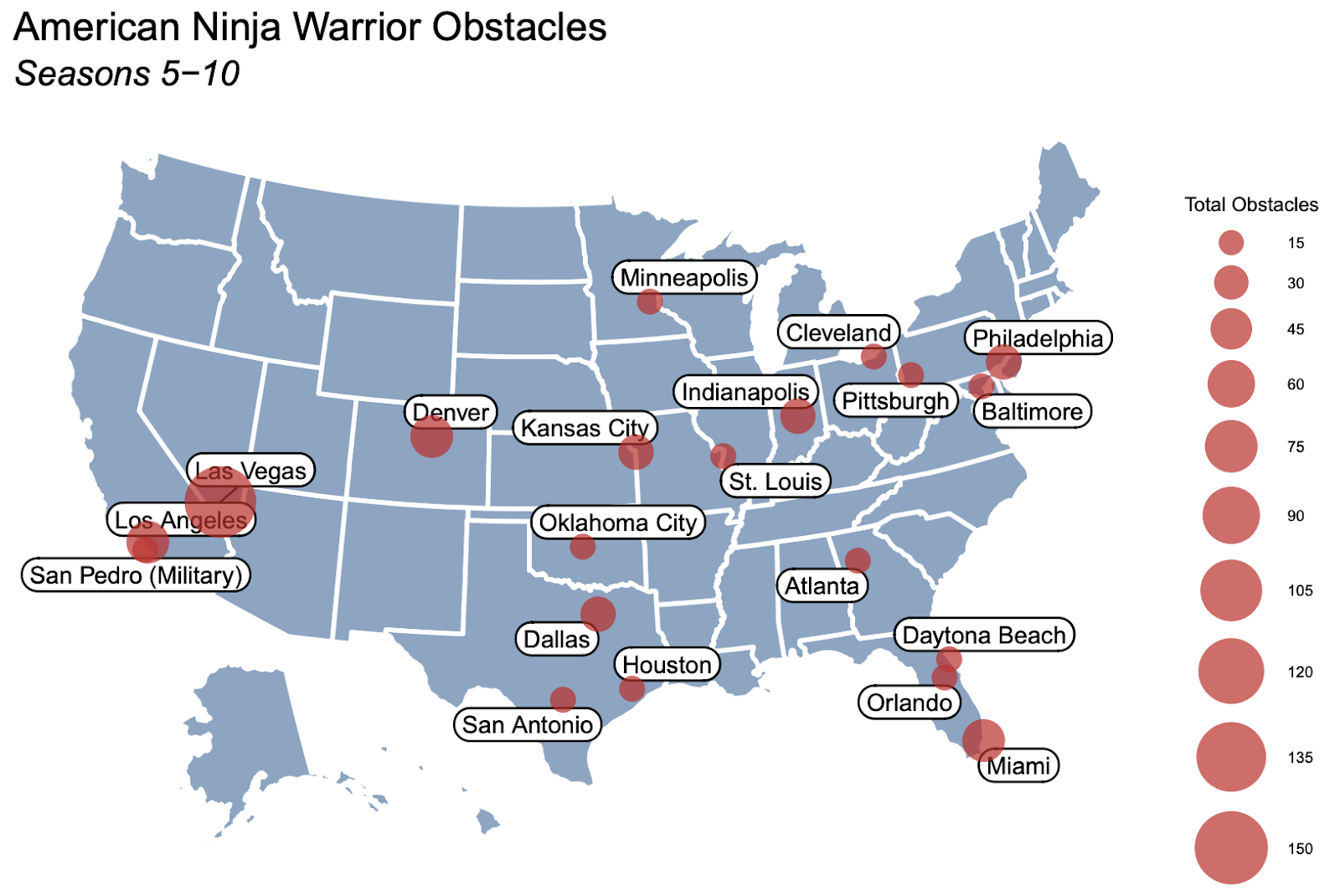 Another fun avenue of exploration is analyzing the vast number of locations where the show has filmed. While the series has travelled across the globe (including episodes in Italy and Japan), we created a visualization that specifically focuses on cities in the United States. In this visualization, the position of the point is mapped to the geographic location of the cities where American Ninja Warrior has travelled. Additionally, the size of the point is mapped to the total number of obstacles used at each location.