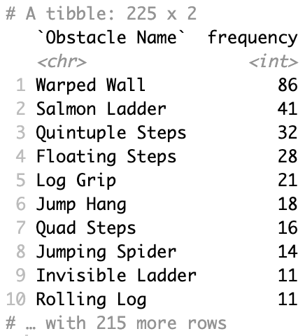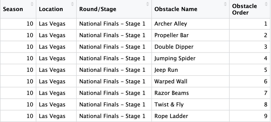 One example of a data story told by our package can be found in the first stage of the national finals of the most recent season (season ten). The obstacles used in this stage can be identified by matching the season (‘season’ = 10) to the round and stage (‘round_stage’ = “National Finals - Stage 1”). Here, we see that the national finals for season ten took place in Las Vegas, and the first stage featured a total of nine obstacles. In order, the obstacles included in stage one of the season ten national finals were as follows: “Archer Alley”, “Propeller Bar”, “Double Dipper”, “Jumping Spider”, “Jeep Run”, “Warped Wall”, “Razor Beams”, “Twist & Fly”, and “Rope Ladder”. Clearly, prospective ninja champions had quite the difficult set of obstacles to conquer.