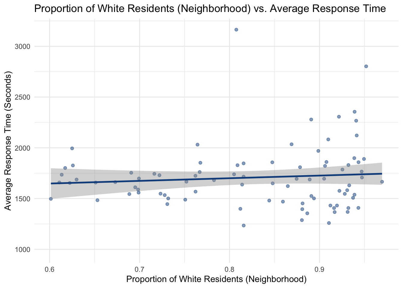 ggtitle("Proportion of White Residents (Neighborhood) vs. Average Response Time") +