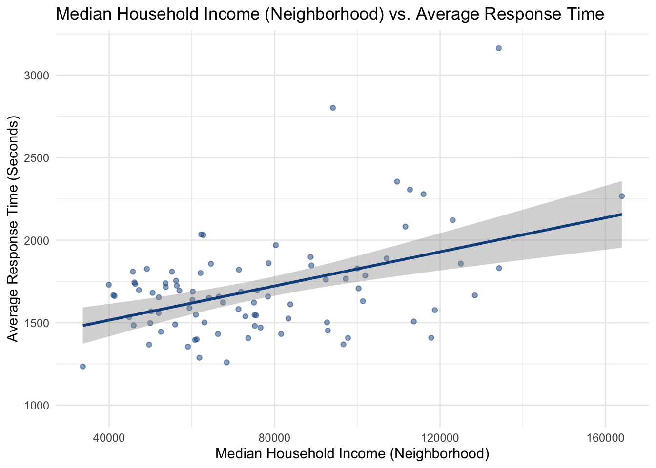 ggtitle("Median Household Income (Neighborhood) vs. Average Response Time") +