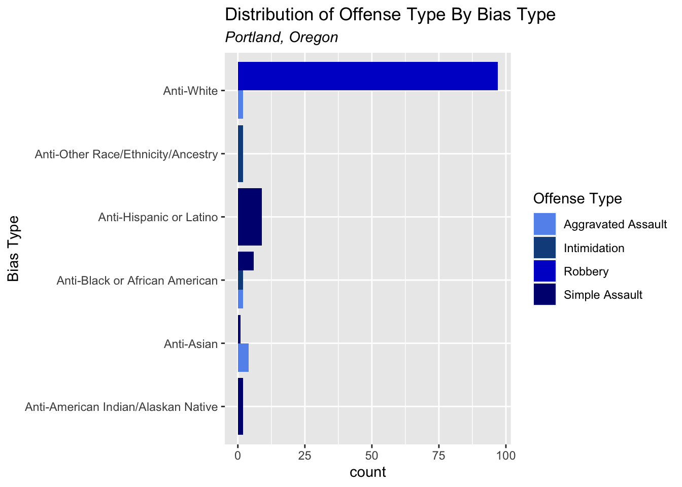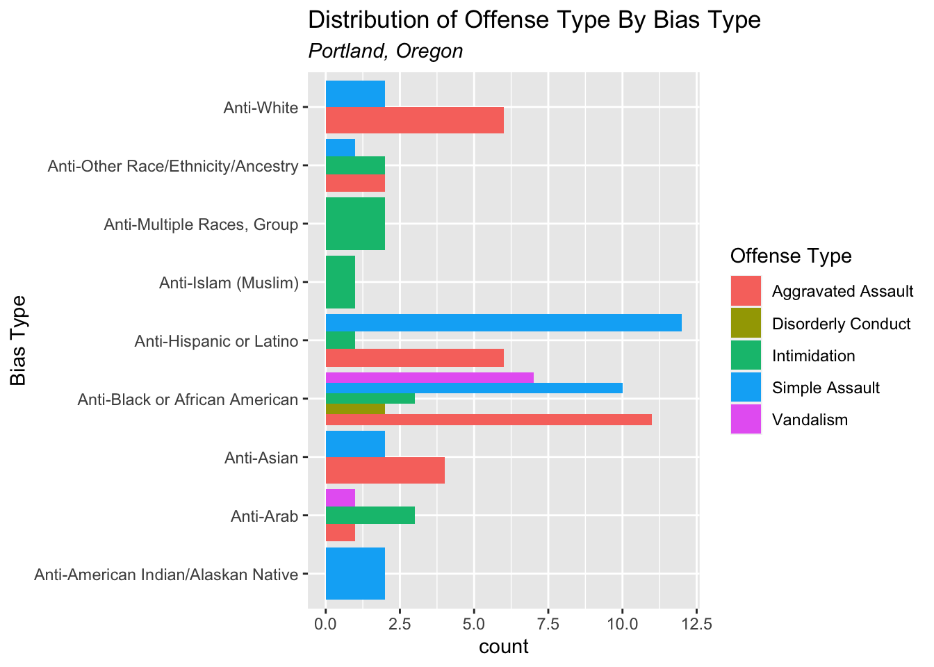 Note that of the neighborhoods with more than 5 observations, 6 of the 8 had a proportion of non-white residents that was greater than 25%, suggesting that perhaps more of these biased crimes are occurring in the more ethnically non-white neighborhoods. To examine this further, now turned to the actual types of crimes being committed. For this, we subset the data even further, into only crimes being committed in Powellhurst-Gilbert and Downtown, as combined, the two neighborhoods reported more than a third of the biased crimes, as well as honing in on the biases involving race and ethnicity.