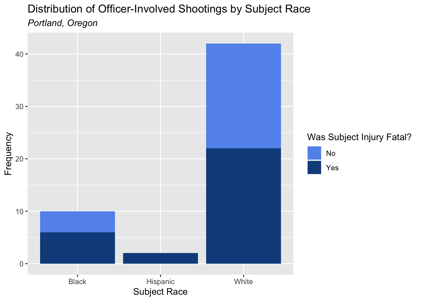 Note now the high incidence of assault, primarily in the minority communities. Many of the nonwhite communities are underrepresented across the Pacific Northwest, and Portland is no exception. Yet frequently these communities are over-represented in crime statistics, and this is yet another concrete example of this over-representation. With the clear biases against minorities in Portland, we present a graph regarding officer shootings segmented by race: