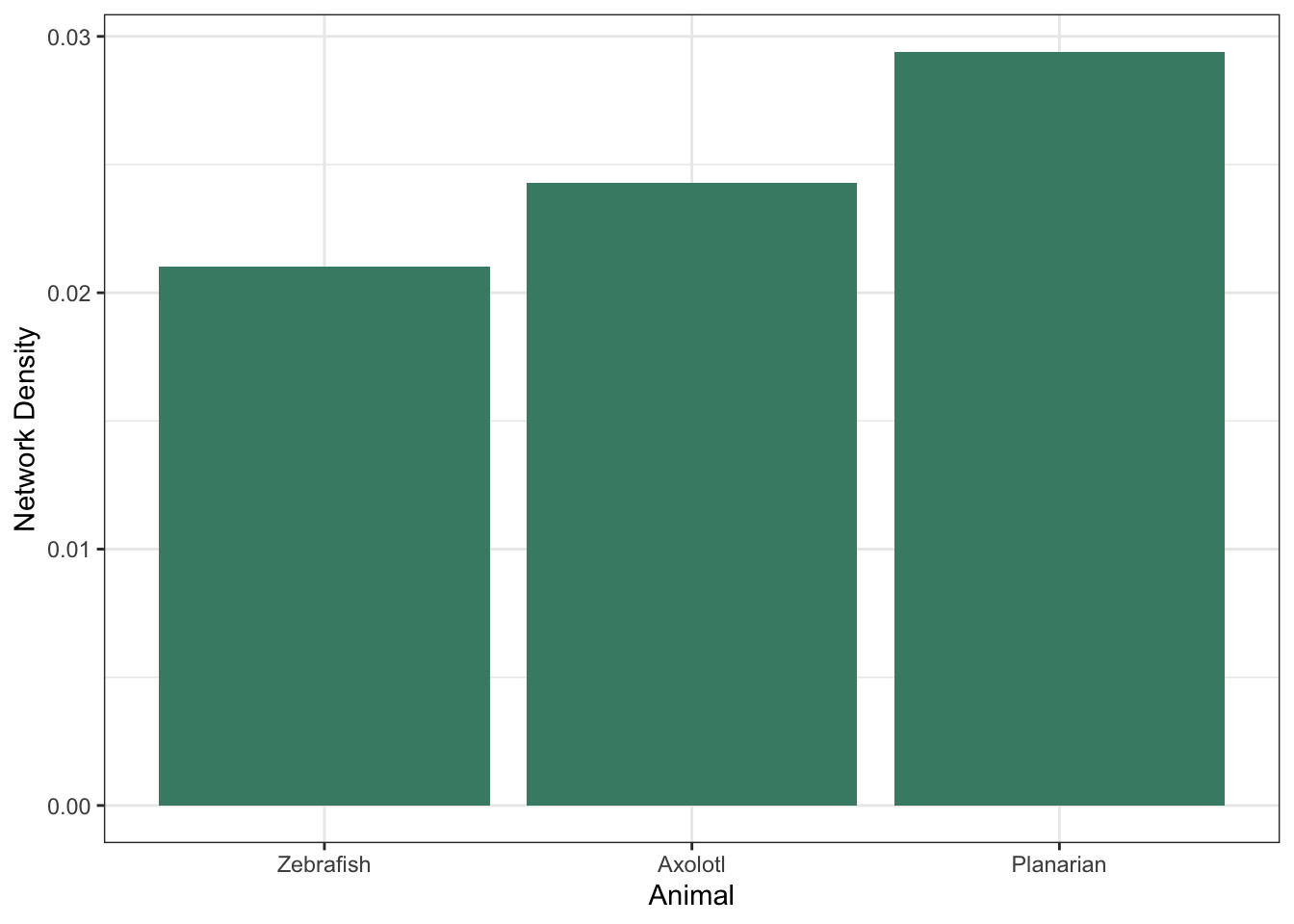 Looking at these networks visually, it becomes clear that the zebrafish regeneration field is less collaborative overall than either the axolotl or planarian field. This can be seen in the number of clusters that are not connected to the central clusters in each plot: there seem to be more isolated labs in the zebrafish plot than in the axolotl or planaria plot. To quantify this, the graph of network density looks at the total connections in the network, over the total possible connections that could exist in the network. This means that we can compare networks regardless of their size, and make conclusions about how connected, or collaborative, they are. In this graph, we can see that the zebrafish network is, in fact, the least collaborative of the three, followed by the axolotl network and finally the planaria network.