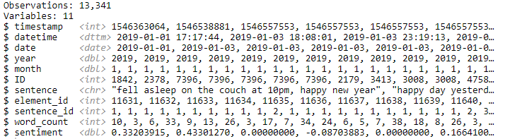 Now that we have a clean dataset, we can find the sentence-level text sentiment using sentimentr. However, some of my posts are more than one sentence long. What we have to do is unnest the posts into sentences, find the sentence-level sentiment, then re-combine the sentences into their posts and use the mean sentiment for that post.