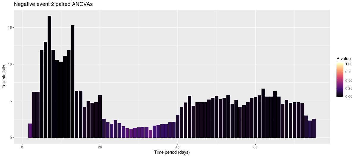 When I compared the means, all of the mean post sentiments after negative event 2 were actually more positive than before. I wonder what this says about my psychological response to a sad incident; maybe a defense mechanism? Anyway, there is an extreme difference between the before and after posts immediately following the event, then the difference between sentiments before and after becomes neglible, followed by a more subdued but still significant period of positive sentiments. The first period lasts 2 to 19 days after the event, and the second period lasts about 40 to 72 days after the event.