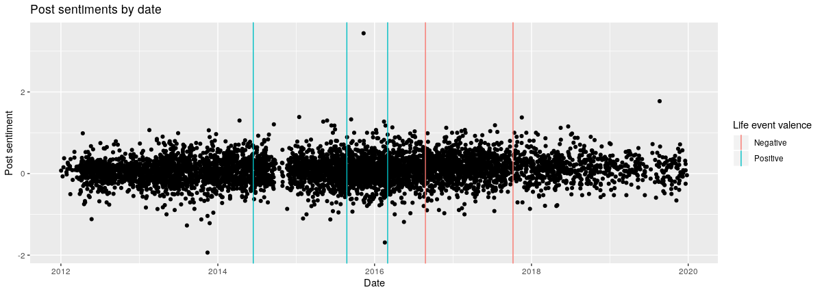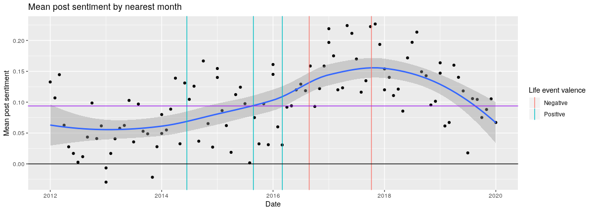 We can see there’s a pretty clear pattern here. Overall, my posts are generally positive. There’s a steady increase in post sentiment as we move through positive life events 1-3, which begins to flatten after negative life event 1 and decreases after negative life event 2. The purple line is my baseline post sentiment, which I got by removing all of the posts within 45 days of each event and then taking the mean.