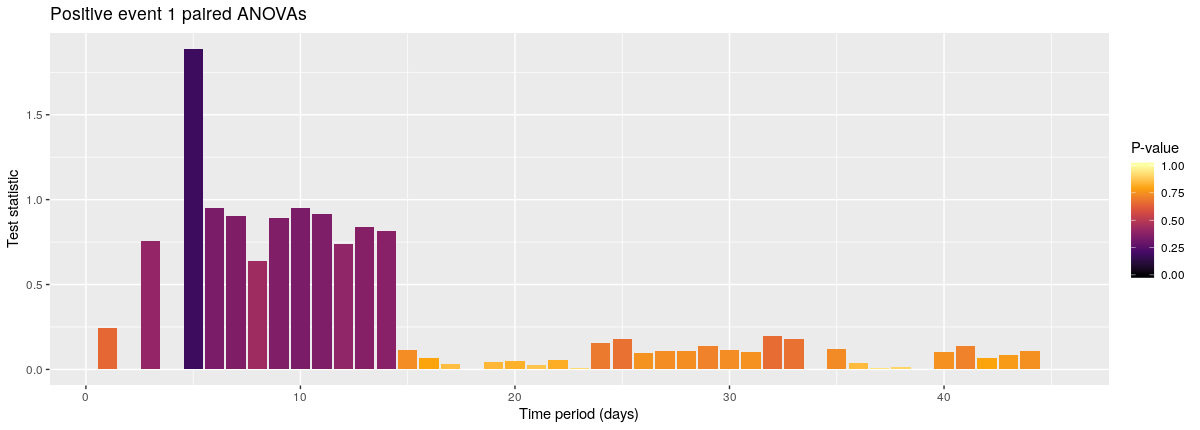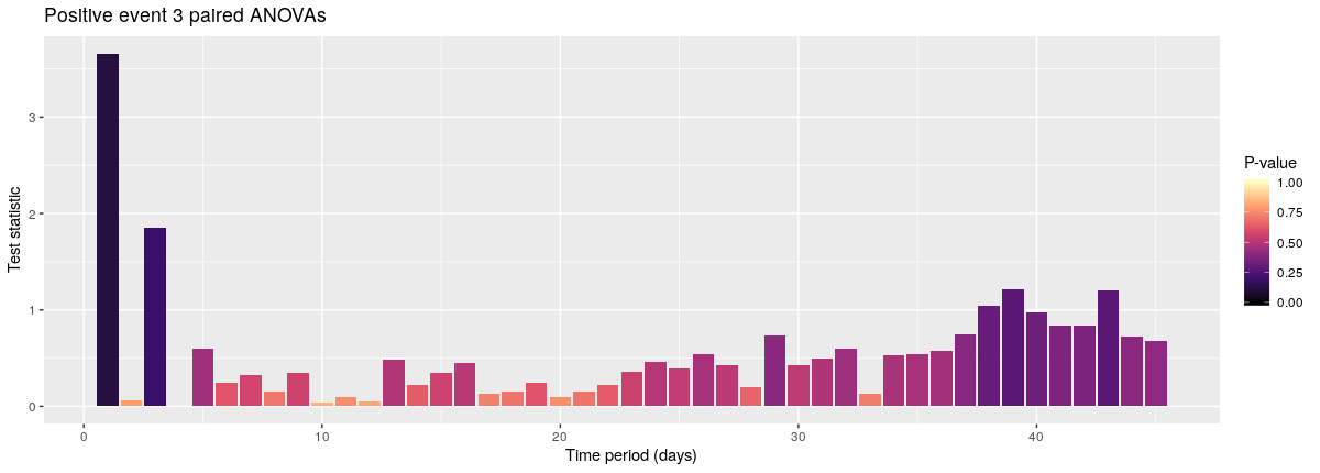 Now let’s take a quantitative approach to our main question: do my post sentiments change after life events? Also, if so, how long does this effect last? We’re going to use paired ANOVA tests for this. So, we’re going to compare the mean post sentiment of posts one day after the event to the mean post sentiment of posts one day before the event, and ask if there’s a difference. We’ll repeat this for two days out, three days out, etc. until 45 days. We’ll also do this for each life event.