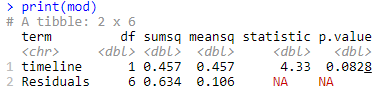 But how did I find this? Let’s get started with positive life event 2, where we’ll see some interesting results. I don’t want to find the ANOVA test statistic and p-value for each time period (one day, two days…) individually, so I’m going to write a for loop. First though, I’ll walk you through the guts of the for loop by running the code for just one day.
