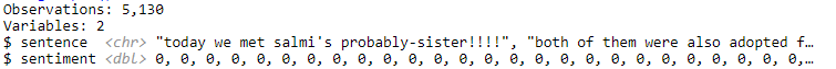 … with the key new variable being sentiment: negative scores for negative sentiments, and positive scores for positive sentiments. But wait, what’s up with the sentences with a sentiment of exactly 0?