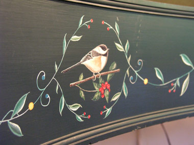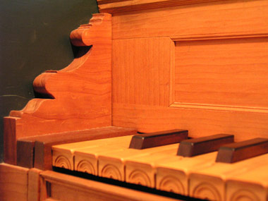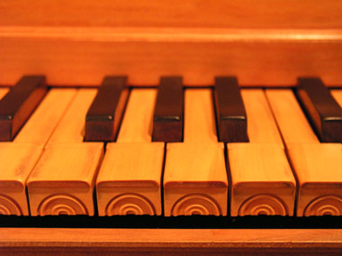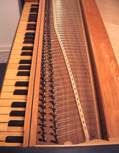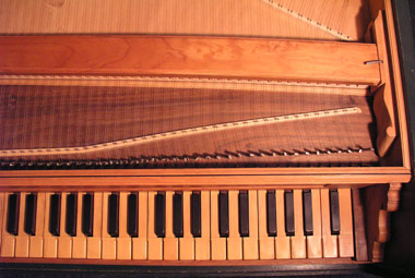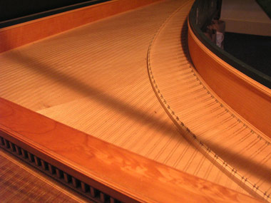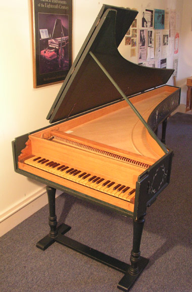 Owen Daly constructed this instrument after one by the Sicilian builder Grimaldi, 1690, with the outer case painted by cellist Lori Presthus. Such instruments were used for both solo and ensemble playing, and to accommodate both period instrument and modern performing styles today this harpsichord can be transposed to either low pitch (A=415) or modern pitch. Its four-and-three-quarter octaves are tuned in Werckmeister II temperament, one of the many “well-temperaments” used in the Baroque period. This harpsichord is ideal for Frescobaldi, Scarlatti and Bach.