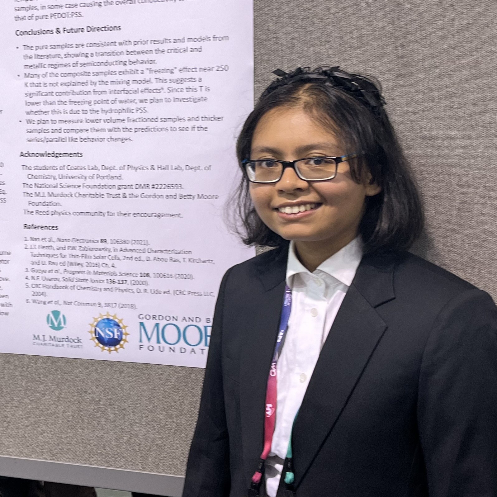 March, 2025. Rubayat won a "top presenter" award at the American Physical Society March Meeting in Anaheim, CA, for her poster, "Electric transport in organic conductive polymer-inorganic nanocomposites". |