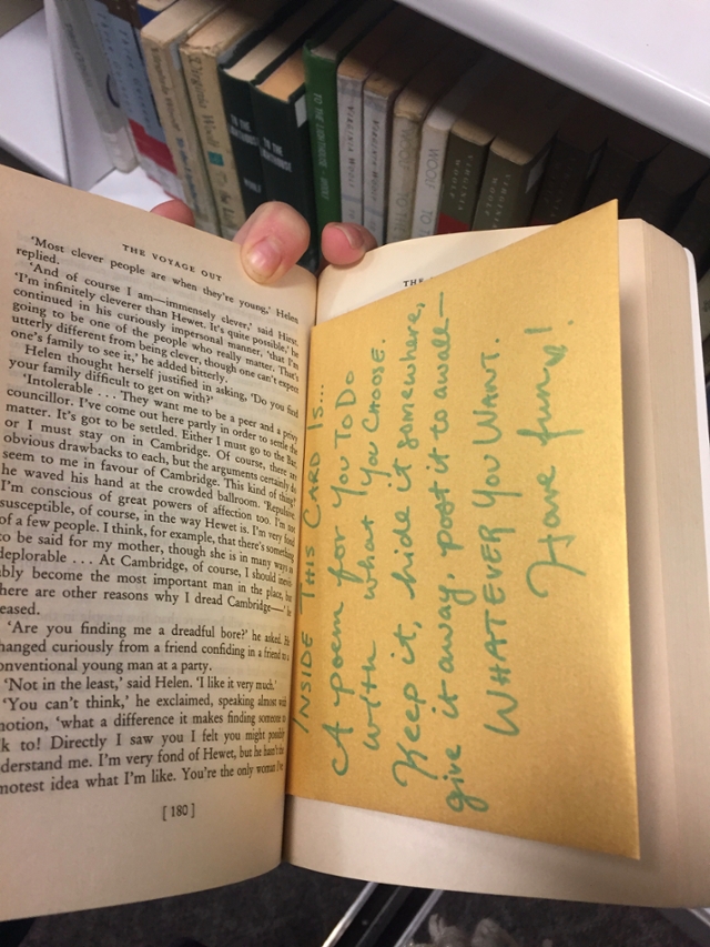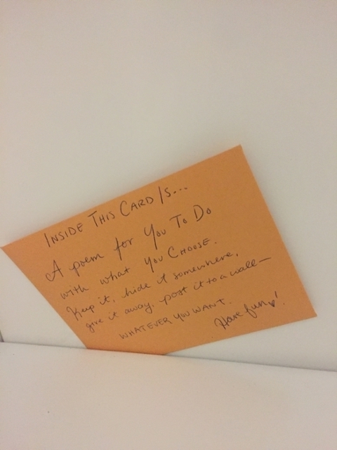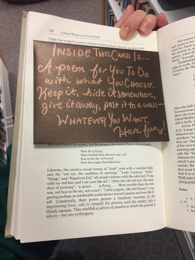 Every week, our Poetry Salon Players bring poetry alive on campus! You might find poems in books, in trees, on doors, in mailboxes. We want to make poetry a part of the campus fabric, and we hope you enjoy these small treasures. See below for photos!