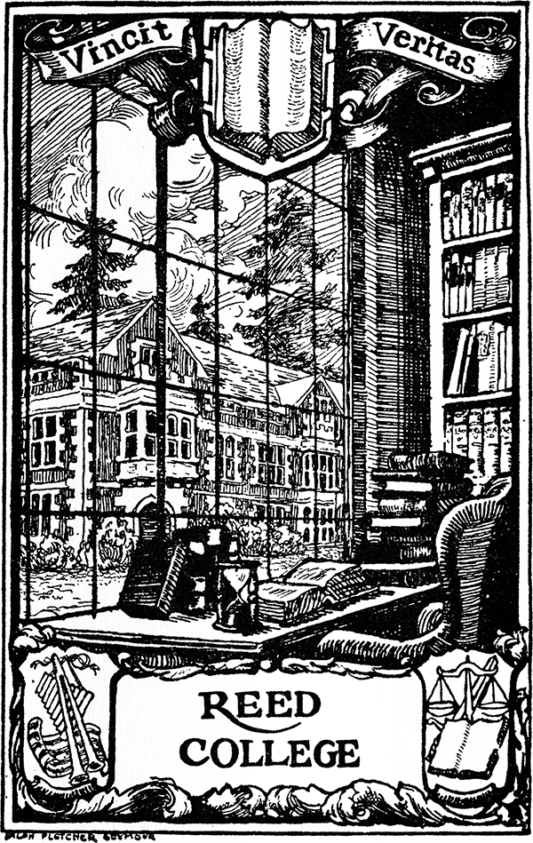Vincit Veritas (“Truth Prevails”) appears on a Reed bookplate that was designed by Chicago artist and printer Ralph Fletcher Seymour sometime between 1925 and 1933. I love the woodcuts produced during the college’s early years and have, in fact, enlarged this one for my office as a daily reminder of the importance of the idea behind these two words.