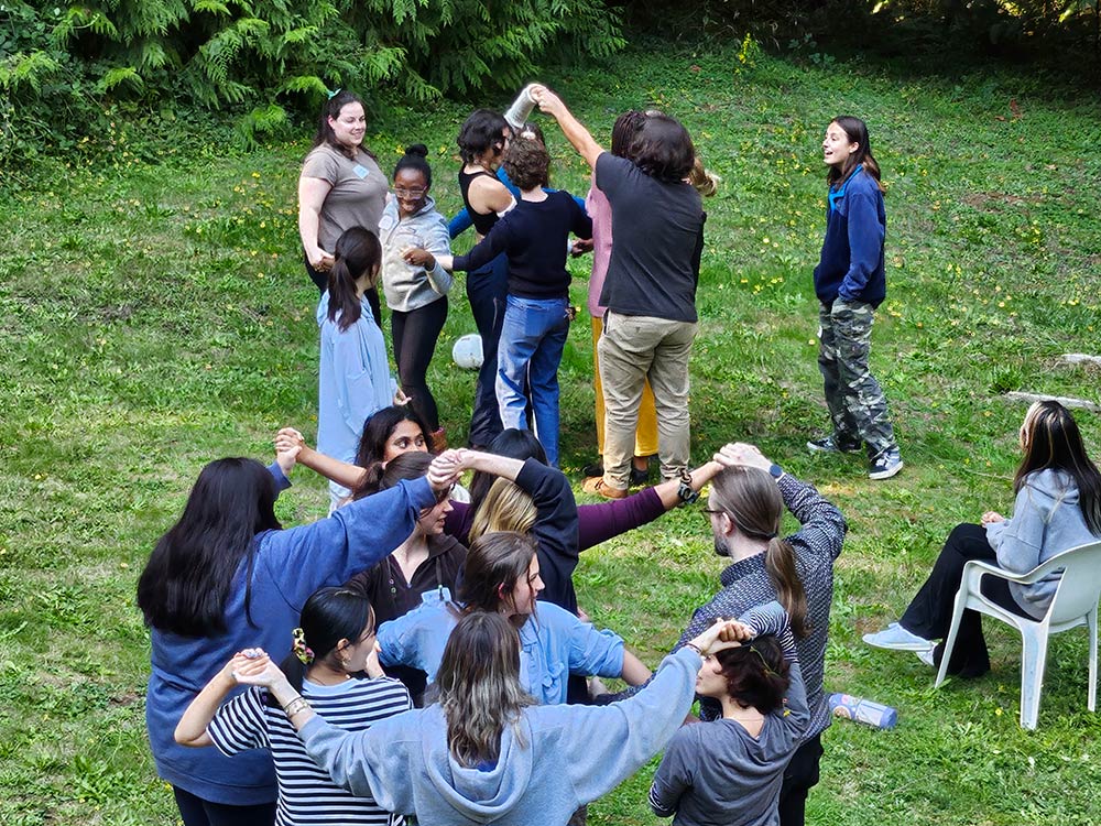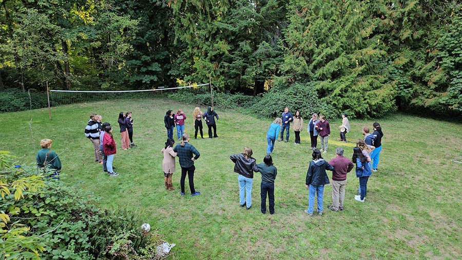 "High on a bluff overlooking the Columbia River, 32 Reed students, sophomores to seniors, gather with 8 psychology professors on a Saturday morning for the 13th annual Squier Retreat at Menucha, a retreat center in the Columbia Gorge. Through Sunday afternoon, students and faculty will explore serious ideas and have fun."