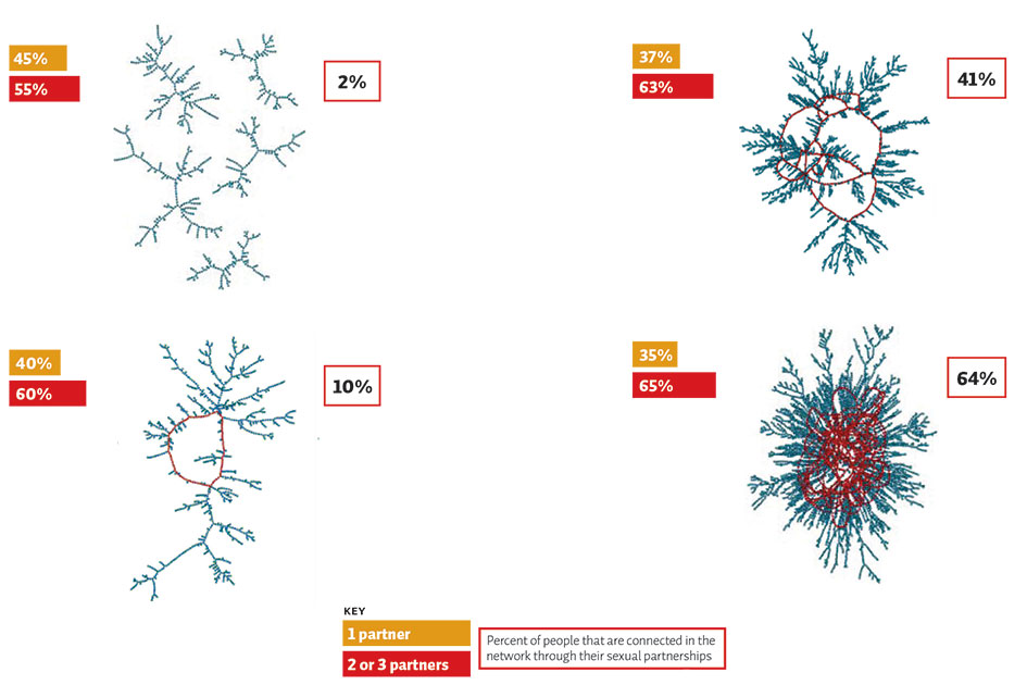 At first, Morris was skeptical. It was well established that the spread of HIV was related to the number of sexual partners a person had over a given period of time. But who cared, epidemiologically speaking, if those partnerships overlapped? The issue seemed to have more to do with morality than with medicine. As she considered the question more deeply, however, she reached the startling conclusion that the issue of concurrency was fundamentally different from the number of partners—and that it might play a dramatic role in the spread of HIV.