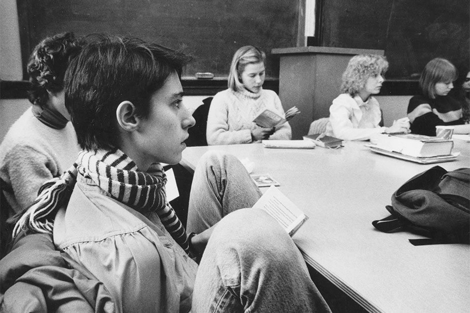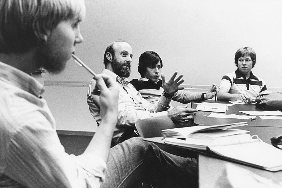 To instigate this kind of critical thinking in the small humanities conferences, professors employed the Socratic method. “You always answered a question with a question,” said professor John Pock [sociology 1955–98]. “The demand was very heavy on the students to do the discovery of the issues, and to analyze and examine a line of argument. It wasn’t a matter of the teacher sitting there and doing a minilecture on something.”