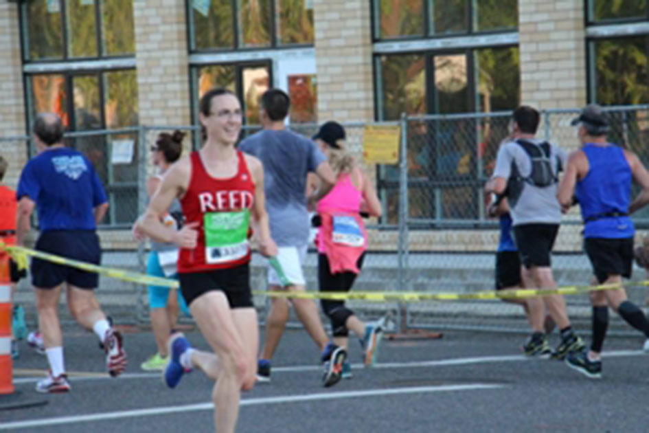 In the Half Marathon, physics major Jack Flowers ’15 came in third, crossing the finish line at an estimated 1:16:35 (but was disqualified by fussy officials—some technicality about his bib). Prof. Kyle Ormsby [math 2014–] crossed the line moments later at 1:16:52, while Prof. Alison Crocker [physics 2014–] posted a scorching 1:23:10, coming in second among women runners and eighth overall. Other fleet-footed Reedies included physics major Trevor Soucy ’18 at 1:28:47, philosophy major Ki Choi ’17 at 1:29:25, and Mike Brody, dean of students, at 1:39:19, who barely edged out poly sci major Xander Harris ’16 at 1:39:51.