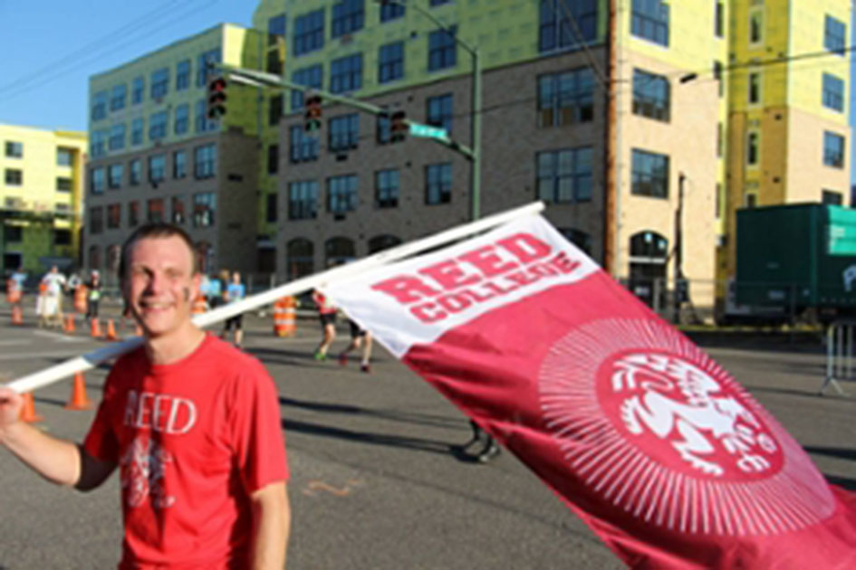 Many other Reed runners tackled the full 26.2 miles, including John Cushing ’67, Terry Hill ’74, John Bergholz ’83, Jim Hutcheon ’90, Melanie Casprowiak ’95, Susie Baunsgard ’96, Clara Siegel ’09, Yasin Karim ’10, Ianthe Mugglestone ’11, Heidi Whitehouse ’13, Malkolm Graffe ’13, physics major Ross Petersen ’15, psych major Austin Pitschka ’16, biochem major Eren Veziroglu ’16, Prof. Rao Potluri [math], Prof. Johnny Powell[physics], campus events czar Todd Pangilinan, and alumni-community organizer Todd Hesse, who ran for a full five hours proudly bearing a gargantuan Griffin standard.