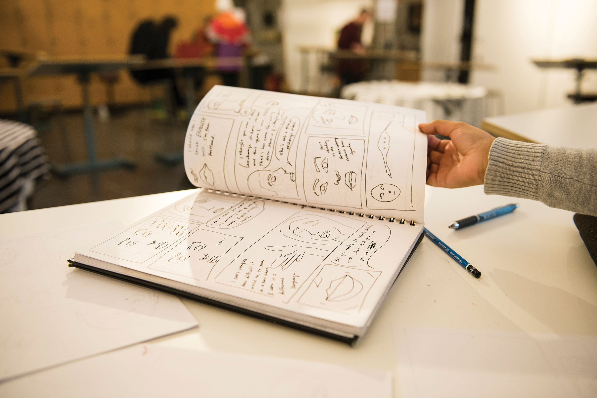 Because graphic novels can be read quickly, there is a misperception that they are easy to create. In reality it is a labor-intensive endeavor. It took Duford several years to complete an 80-page comic novel, which can be read in less than an hour. To tap into the physical experience of making comics, he pushes his students to draw lots of pages. The class is organized so that most drawing assignments begin in the classroom and are finished as homework.