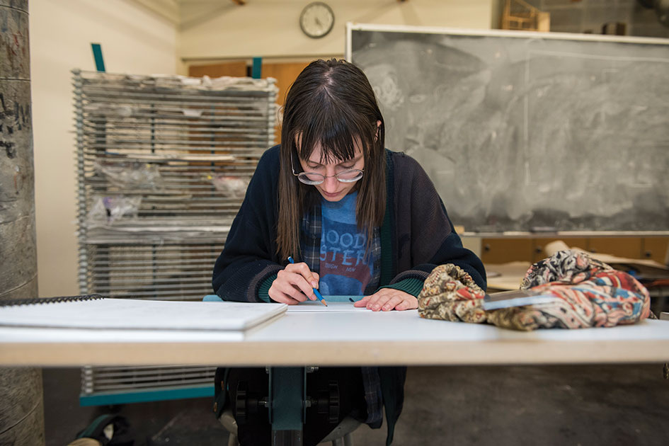 “If you’re quick enough technically I guess you could get an assignment done in class; but I don’t think anyone ever has,” says Shin Dickens ’17, a classics/religion major. “This is my most work-intensive class, but it occupies a different space in time. Before I do anything large, I start with small, thumbnail sketches to get the flow. I’m a nocturnal person and sometimes I go into the art building at 10 p.m. and work until 4 in the morning. I can’t do readings like that, but I can come in and draw like that.”