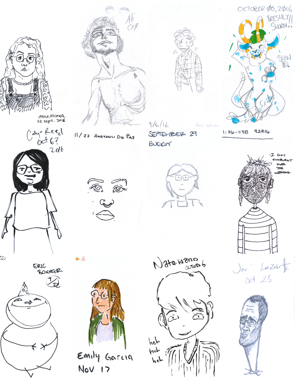 At the beginning of every class, Duford asks each student to draw a cartoon self-portrait before they go to work on their projects. They scratch away with pencils and pen nibs on Bristol paper as he makes the rounds, offering tips and suggestions. “I would broaden this line; a really thick line will give it more weight.”