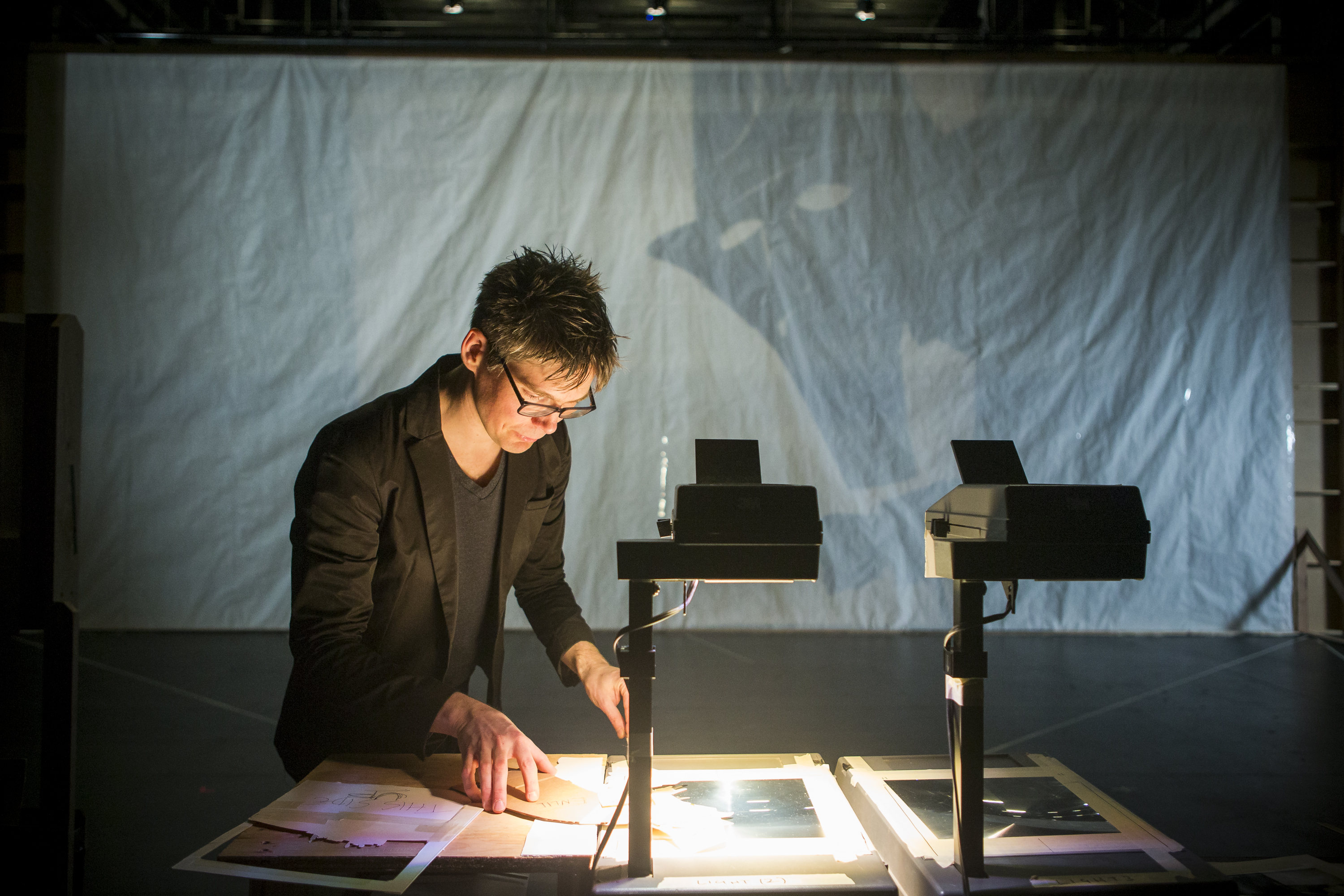 Ultimately, he chose props and scenery that could be sent to Norway ahead of time, like folding chairs, tables, and boxes. He then designed a series of floor plans that would be changed out at each interlude in the opera. Making the show a second time for the North American premiere, he added more changes in the lights, playing with the way the lighting might counter or augment the energy in the room at certain moments of the opera. Taking into account the band’s preference for house lights over elaborate lighting design, he designed the opera’s lighting with floor lamps and bare lightbulbs and chose a daylight temperature for the backlights, which at one point he turns on the audience.
