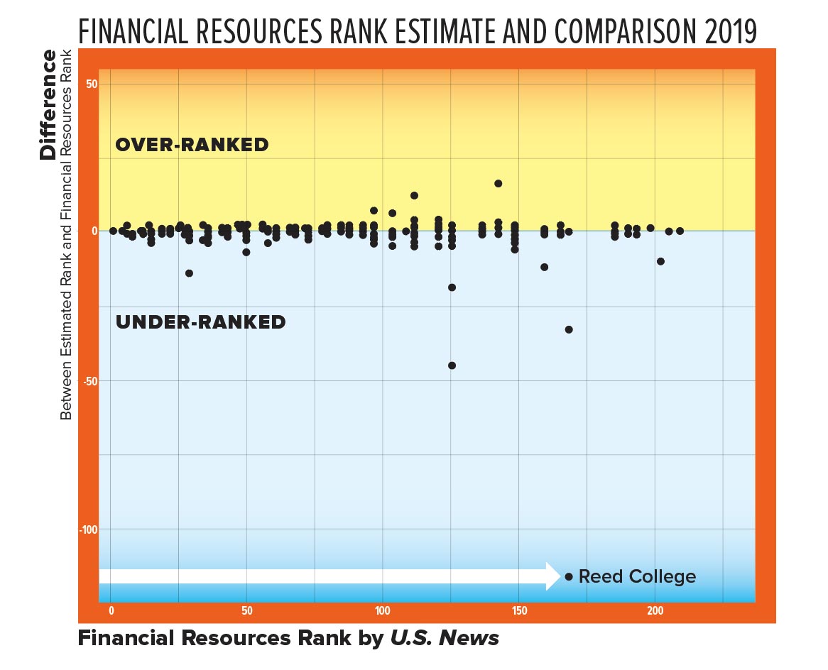 To understand how this works, take a look at USN’s “financial resources” score, which is based on factors like faculty compensation and expenditure per student (which we saw before.) The students plugged IPEDS data for all colleges into the formula they worked out for financial resources, and compared their predictions with the actual scores. In most cases, their estimates were very close. Some were a little over, some a little under. Reed was off by more than 100 places.