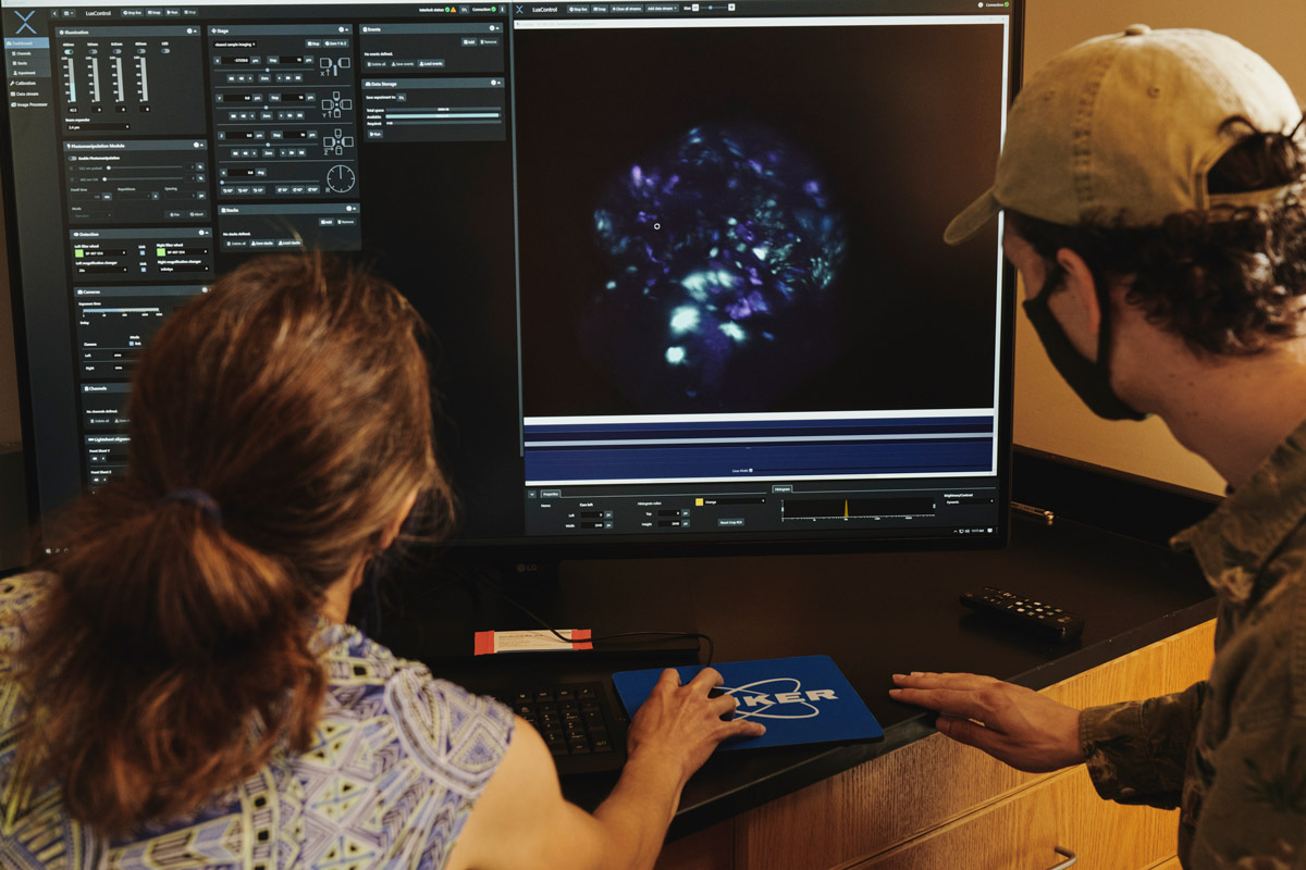 A light sheet microscope gives researchers the ability to create a 3-D image of a sample without damaging it. This means scientists can observe a living organism’s development in real time, watching cells divide and differentiate. Previous advanced imaging equipment was unable to accommodate entire living organisms or would disrupt the system it was capturing. “Cells don’t do well under the long blasts of a laser,” says Cerveny, whose research of the eye structures in zebrafish embryos will help advance our understanding of the formation of the visual system.
