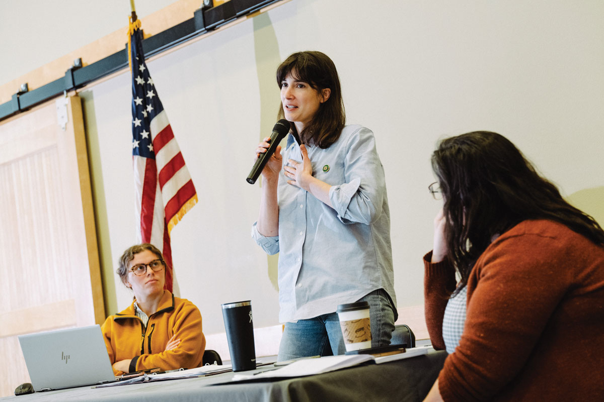 Staying in the know, however, is a gargantuan effort, one that the congresswoman says other representatives in “safer” seats don’t have to worry about quite so much. We’re at stop number two of four, a light day according to Tim Gowen ’10, her deputy district director, and Gluesenkamp Perez looks a little wan. She’s recovering from a bout of the flu that left her, her husband, and their 19-month-old son sick with fevers earlier in the week. After one day off, she’s back on the road. Still, her gaze is steady as she smiles and waves hello to the people she knows in the crowd. She holds it trained on every speaker over the next two hours, nodding and taking notes and occasionally interjecting with excitement or concern, never once yawning or looking away.
